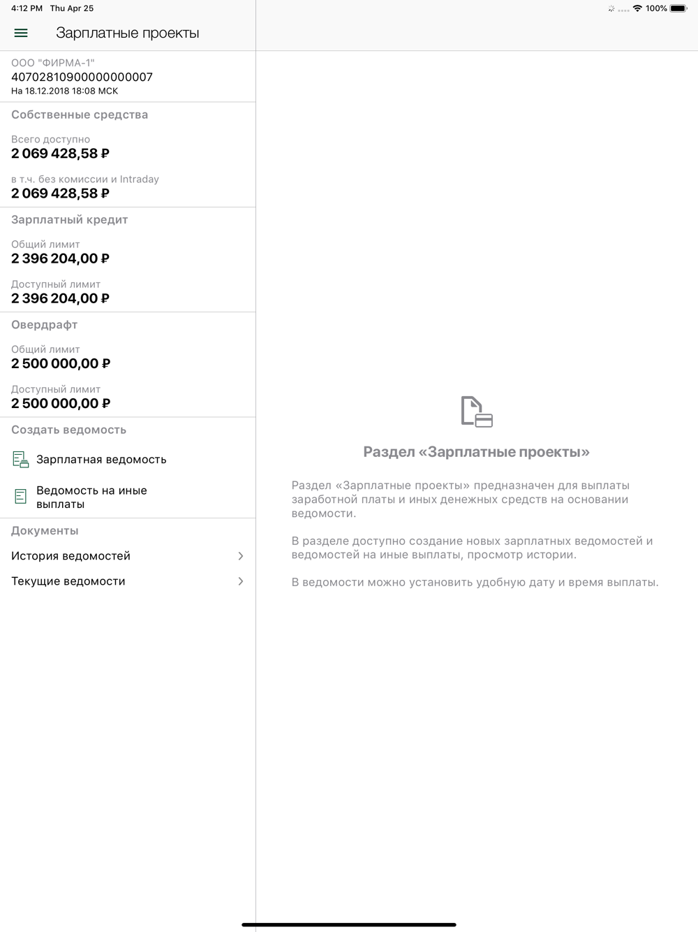 Приложение обеспечивает доступ к информации по счету: об остатках, операциях, ожидаемых поступлениях, заблокированных суммах, реестрах эквайринга. Информация детализирована до первичных документов, которые можно сохранить в файл PDF.