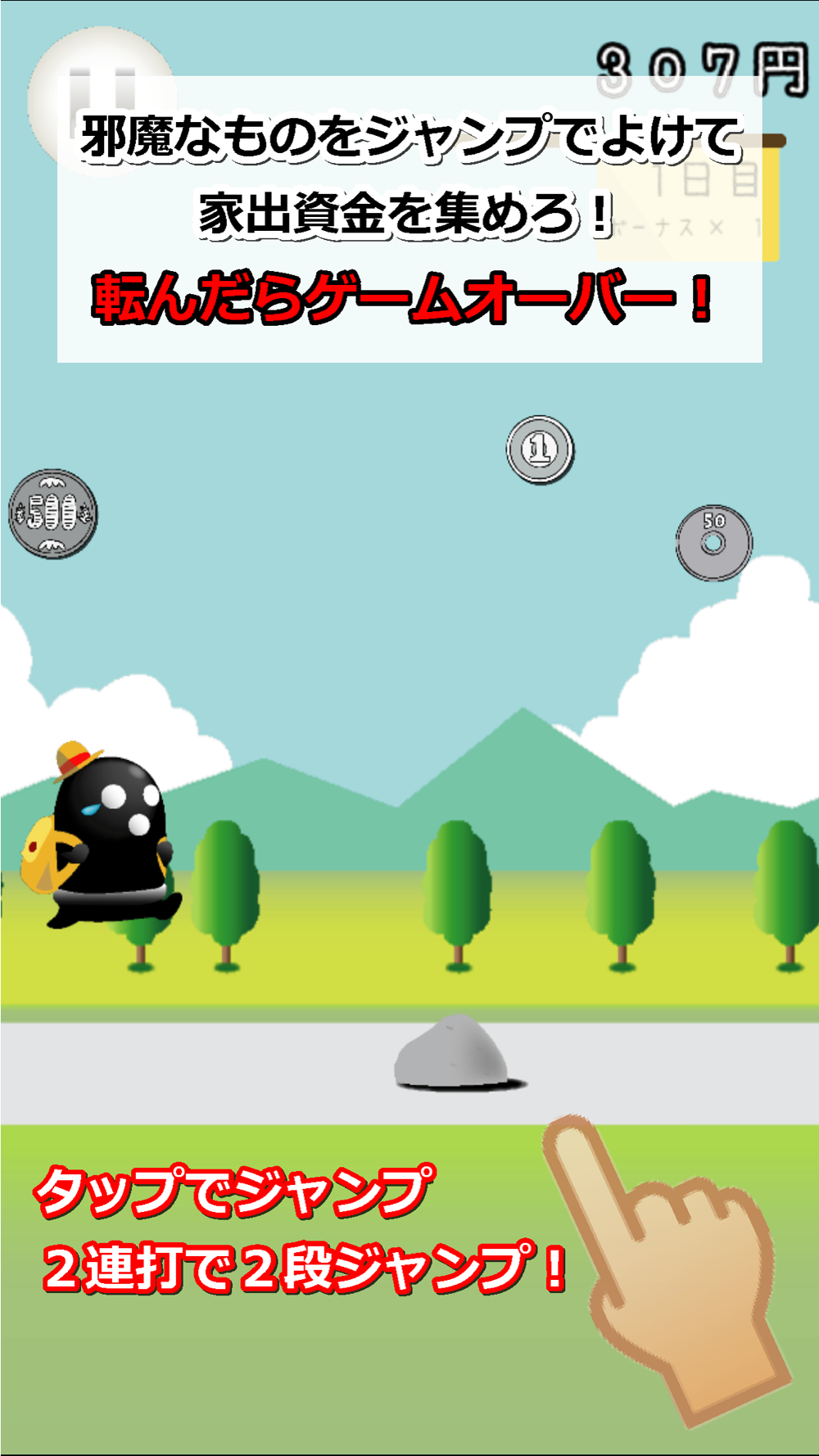 障害物の石をうまくジャンプで避けながらお金を集めましょう!