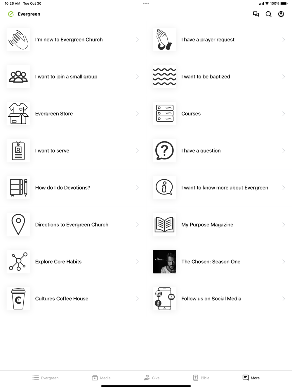 Evergreen Church is all about Jesus changing lives through you. To help people change lives this app will include, live services, previous messages, a full ESV Bible, a Bible reading plan, and you can give right on your phone or tablet. After you have experienced and enjoyed content, you can share it with your friends via Twitter, Facebook, or email.