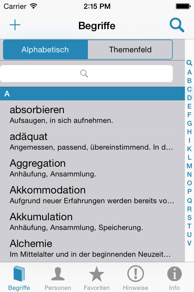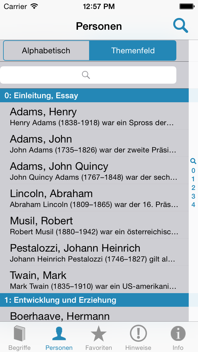 Diese App ergänzt das «Lehrbuch Pädagogik» aus dem hep verlag. Sie liefert Informationen zu sämtlichen in der Randspalte des Buches aufgeführten Begriffen und Namen: Einerseits werden unter der Rubrik «Begriffe» zahlreiche Fachbegriffe und Fremdwörter definiert. Andererseits bietet die Rubrik «Personen» Wissenswertes zu den im Buch genannten Personen. Beide Listen können sowohl alphabetisch als auch nach Themenfeldern geordnet werden.