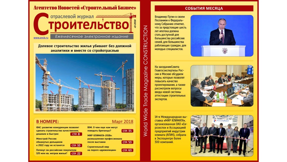 The magazine is intended for professionals in the construction industry. The purpose Publishing - professionally competent, objective, balanced coverage of the situation in the construction and related industries. Published only exclusive articles on the presentation of new technologies, construction materials, machinery, equipment, issues of construction management, etc.