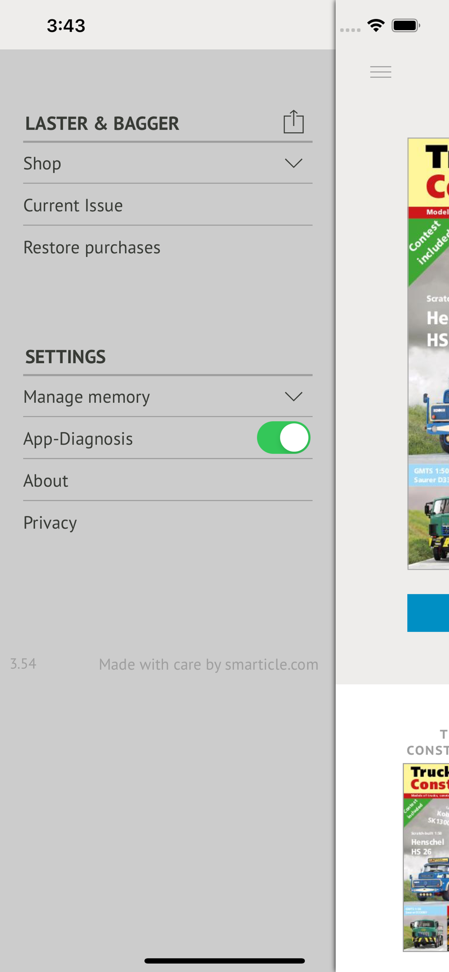 Trucks & Construction - The collector's magazine about models of trucks, construction machines, cranes and heavy duty is published every two months fully digital. In addition to the photographic and textual quality, special emphasis is placed on a balanced content. Thus, in addition to the latest model novelties, further in-depth information about the hobby is provided. In each issue, a collector and his collection are introduced, and building instructions explain how to rebuild models or build dioramas. A page with a sheet metal model from the time of our first sandbox games is also not missing, as are various model reviews. Despite the focus on collector models, articles on large trucks and construction machinery are also included. The mix of topics is rounded off with a competition in which the aim is to guess the make and type of an old vehicle.