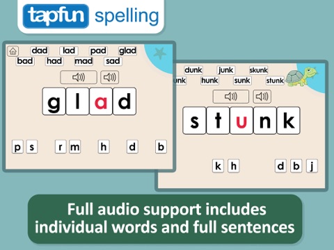 每节课的重点主要信模式,包括一些在这种模式的话,学生法术。第一课是“在”词族。一旦学生拼写目标词,应用程序将提示他们拼序列中的一个单词。该应用程序会自动跟踪学生有多少错误,每节课时作出。
