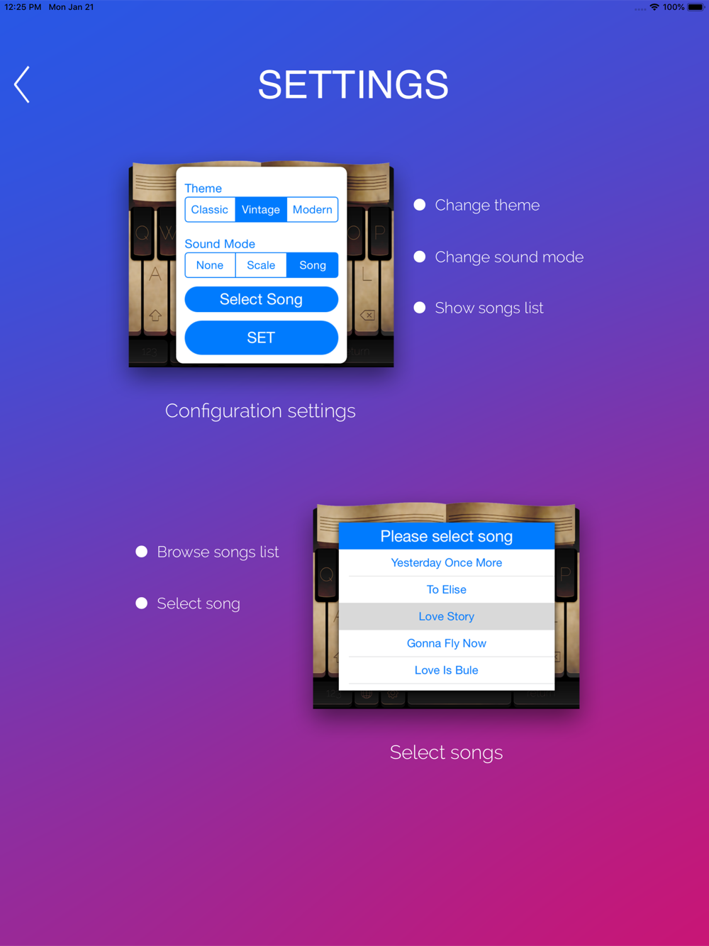 1. Three different Piano Keyboard themes [ Classic / Modern / Vintage ].