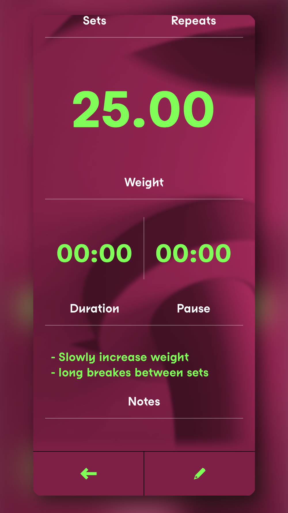 Each exercise can consist of the following details: sets, repetitions, weight, pause, duration, and notes - you determine which details are important.