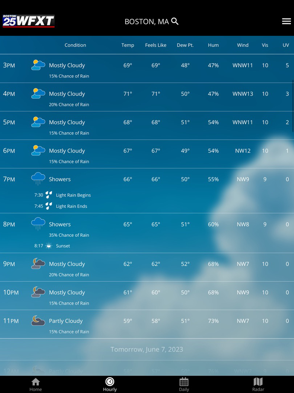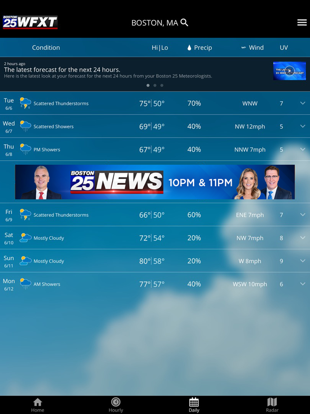 - Locally developed weather forecasts from the Boston 25 Weather Team. Select a specific location to see a local forecast. The app tells you which member of the Boston 25 Weather Team crafted the local forecast. The weather changes rapidly in New England, so forecasts from national apps pre-loaded on your device lack the local expertise when severe weather threatens. The Boston 25 Weather Team is focused solely on getting the local forecast right.