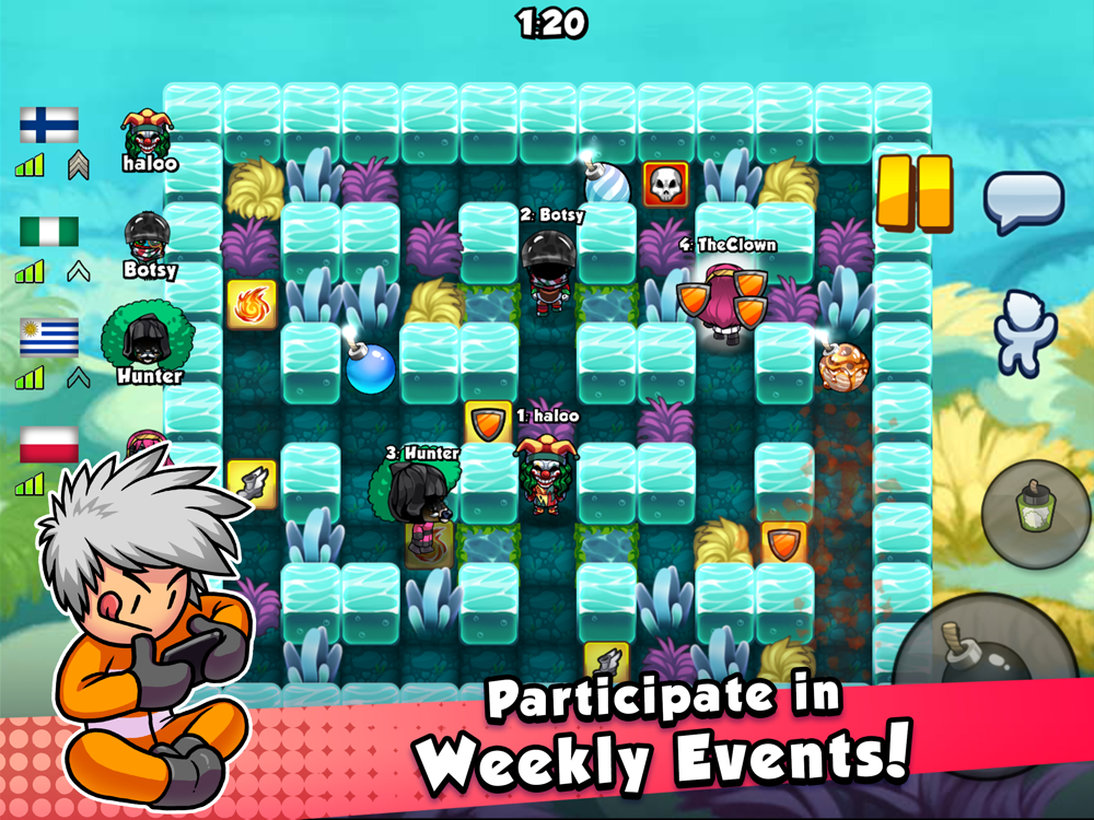 - Two weekly events with exciting gimmicks, fascinating maps and awesome rewards! This is how you gain gold coins, gems, cards and new accessories for your Bomber!