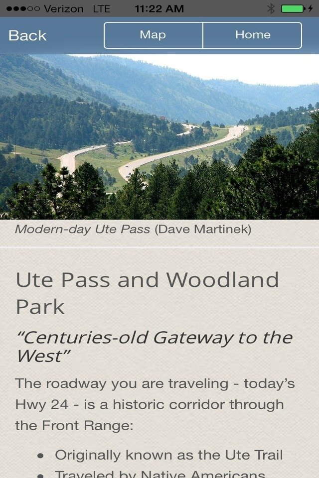 The app guides you on a driving tour composed of seven distinct routes. The routes can be taken singly or in sequence. Each includes suggested stops, as well as points of interest that can be viewed from the road. Together, the routes cover the major attractions of the county: gold mining (historic and present day), pioneering railroads that served the mining and timber industries, National Historic Districts and landmarks, Victorian architecture and stunning mountain scenery. Pike National Forest, Mueller State Park and open spaces offer hiking, camping, wildlife viewing, and relaxation. Florissant Fossil Beds National Monument showcases 34 million-year-old fossils and some of the largest petrified redwood stumps in the world. Audio and video clips convey the flavor of the past and explain the present.
