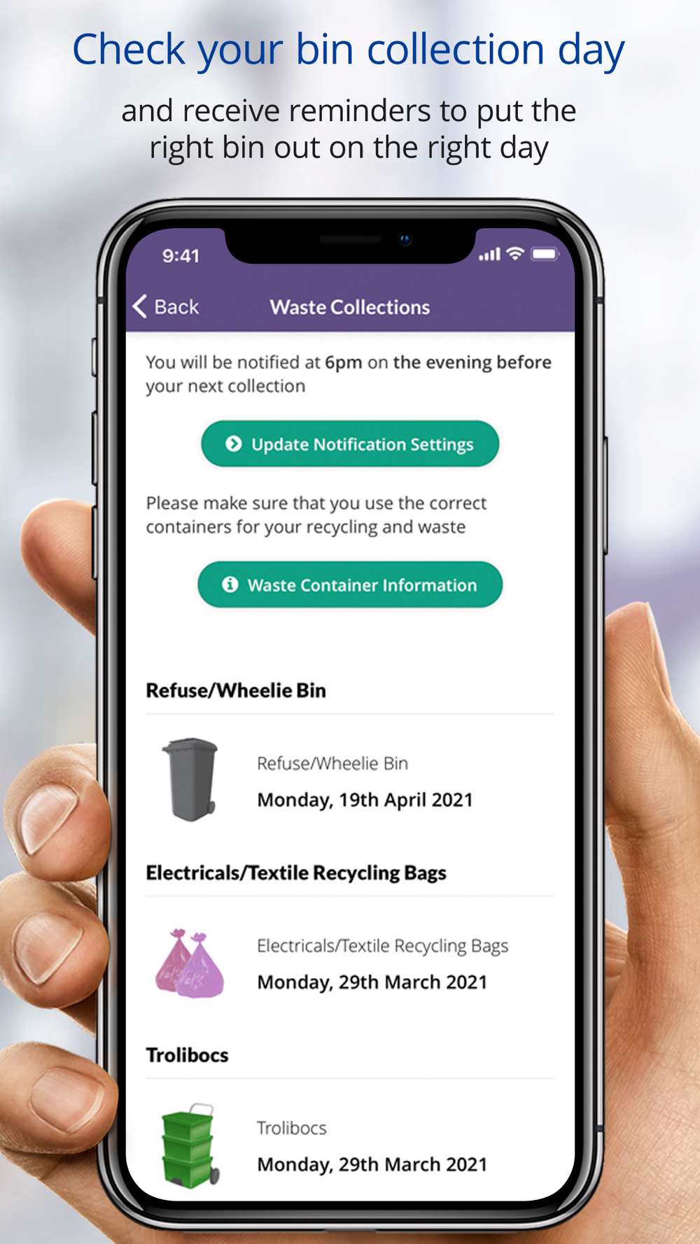 The Conwy App is fully bilingual and will provide you with support for the most common waste and recycling questions. It has been designed to help you find out and remember your collection day, locate your nearest recycling bank or centre and discover other helpful info.