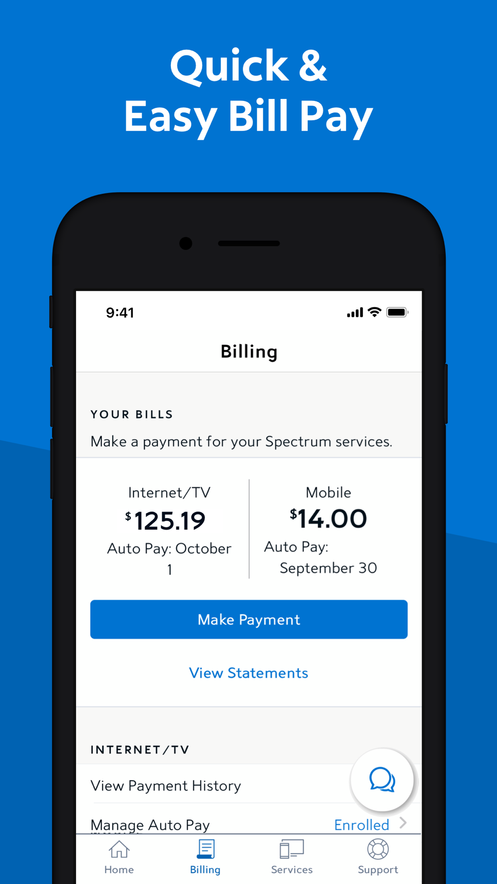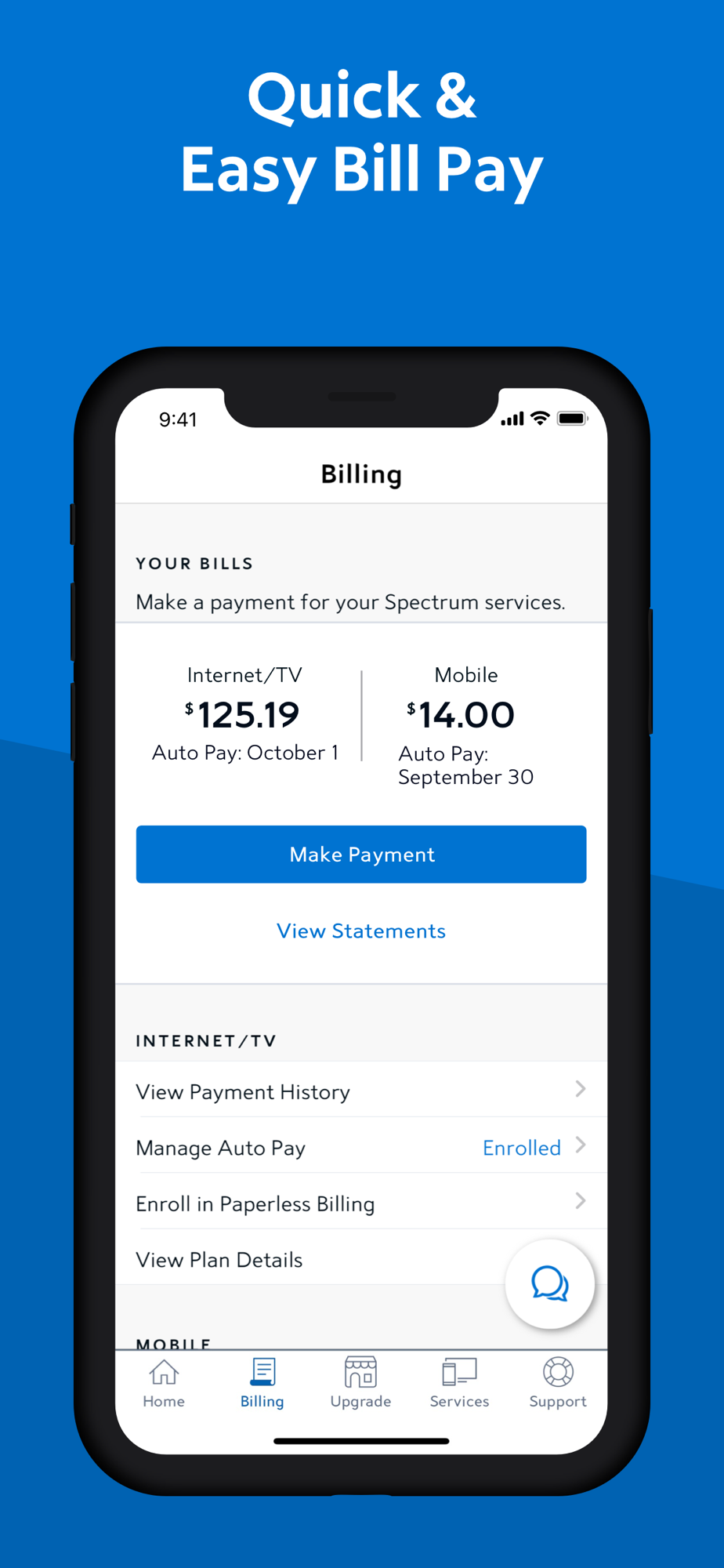• Pay your bill for Spectrum Mobile, Internet, TV and Home Phone.