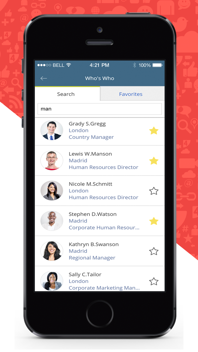• Access your social profile and know your co-workers better, with all the information you may need in a collaborative environment. Find each member of the organization quickly and easily using intuitive searches.