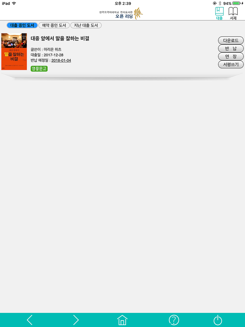 한국외국어대학교 도서관 대출회원으로 인증한 이용자를 대상으로 전자책 서비스를 제공합니다. 전자책을 검색, 대출하여 스마트폰을 통하여 언제 어디서든지 책읽기가 가능합니다.
