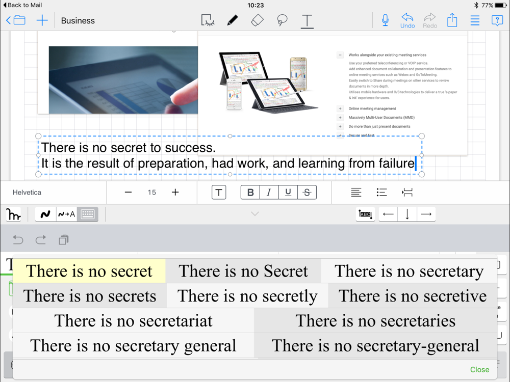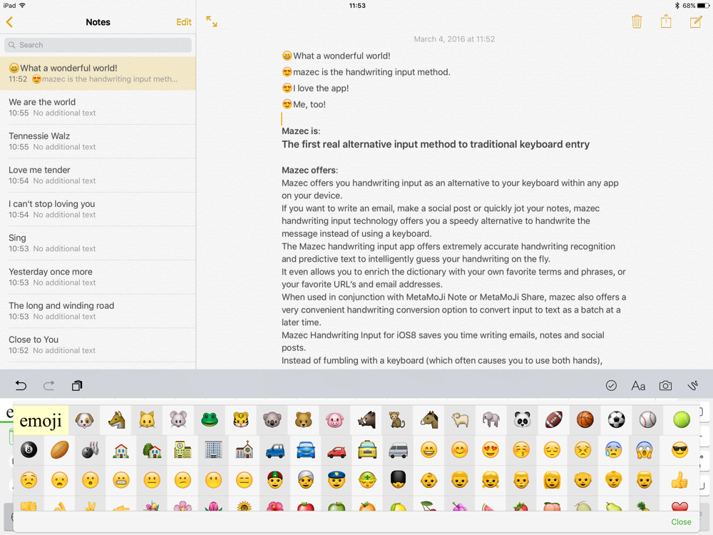 Mazec handwriting input method for iOS saves you time writing emails, notes and social posts. Instead of fumbling with a keyboard (which often causes you to use both hands), with mazec all input can be completed with the touch of a finger. Mazec handwriting input provides handwriting conversion while you are on the go. Its advanced technology is due to vast semantic databases built over MyScript, the world leader in handwriting recognition technology.