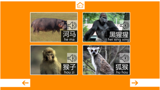 哺乳动物声音应用中包含了32种哺乳动物的声音,图文并茂,并配有相应的动物名称和拼音。