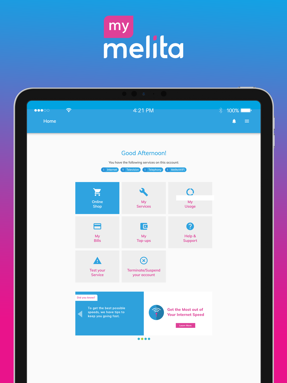 Adjust your services: add faster internet, another mobile, more TV channels, or suspend or terminate individual services or your whole account – all in one place.
