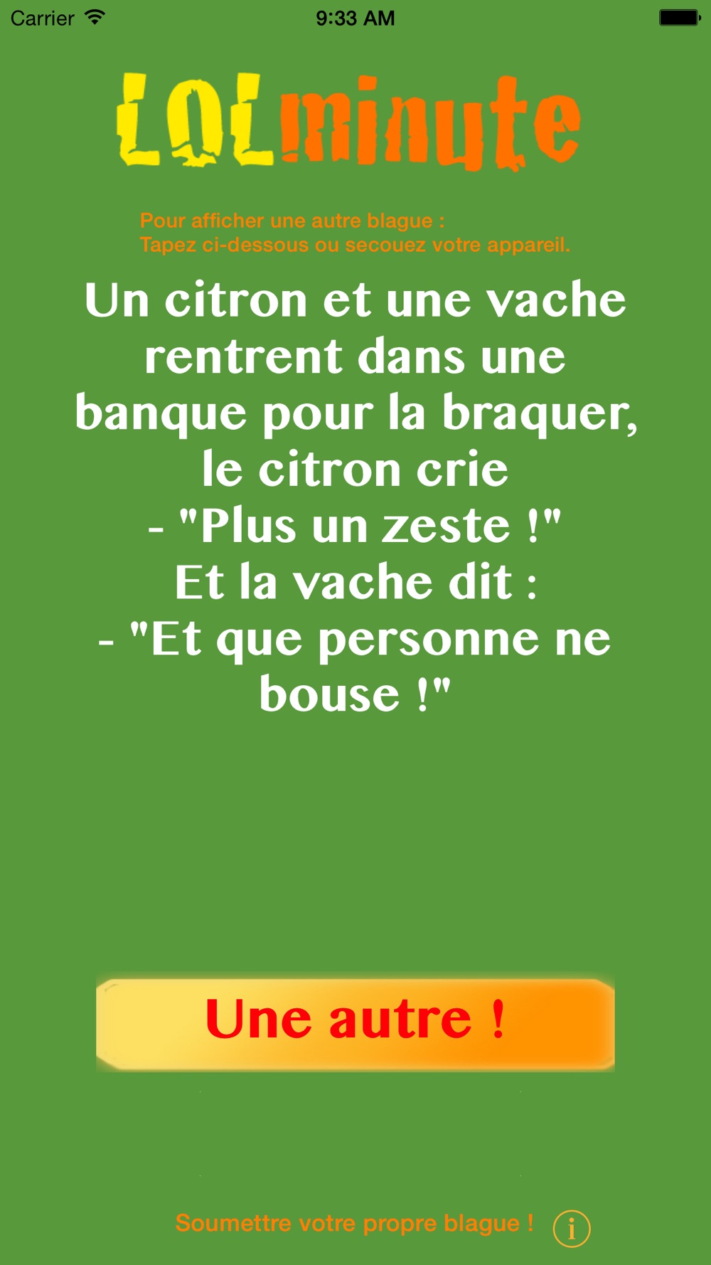 - Fonction "Shake" pour afficher une blague aléatoirement en secouant l'appareil,
