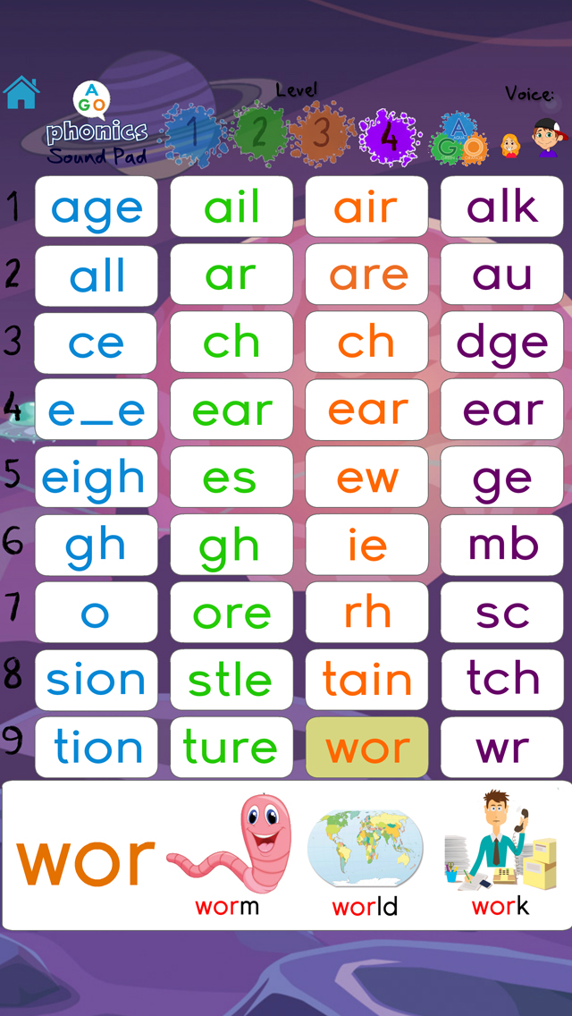 AGO Phonics Sound Pad is a fun sound board tool for exploring and learning phonic sounds. It is particularly suited for Kindergarten - grade one and two elementary school students, and EFL / ESL students in their first years of English study. Users can hear clearly voiced phonic sounds and related English vocabulary at the touch of a button via a colorful and intuitive layout! You can switch between male and female voice.