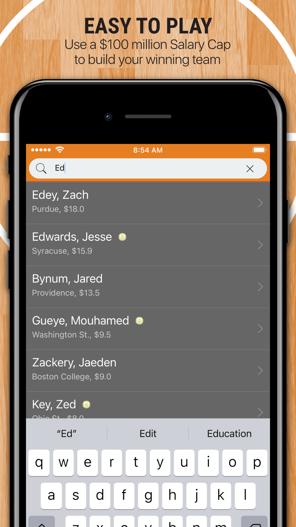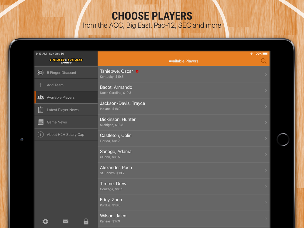 Using an imaginary $100 million bank account, pick your team of 10 2023-24 college basketball players (from the AAC, ACC, Big East, Big Ten, Big-12, Pac-12 & SEC Conferences, and any other teams in the AP Top 25), that you think will rack up the most points each week using the Head2Head scoring system. The players listed have been assigned a salary based on past performance and expected performance this season. Choose 10 players regardless of position and must not exceed the salary cap. Your players will earn Head2Head Fantasy Points based on their actual on-court performance.