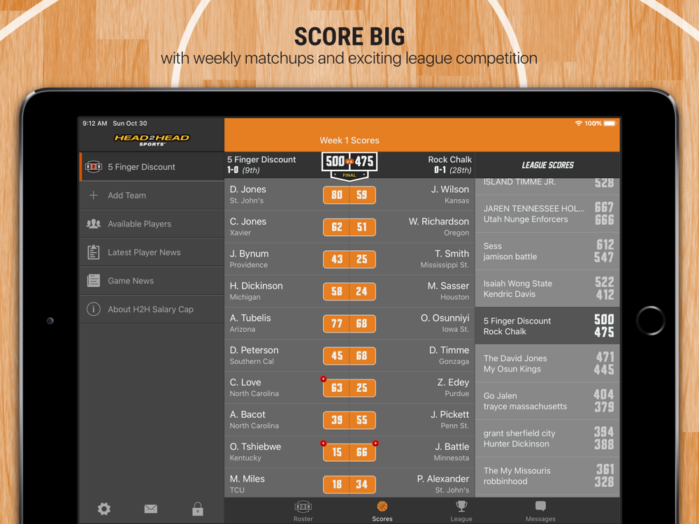 H2H College Fantasy Basketball is not sponsored, endorsed or administered by, or associated with the National Collegiate Athletic Association (NCAA), any NCAA school or player, or Apple and its affiliates. No purchase necessary. All entries must be received by Tuesday, November 28, 2023 to be eligible to play.