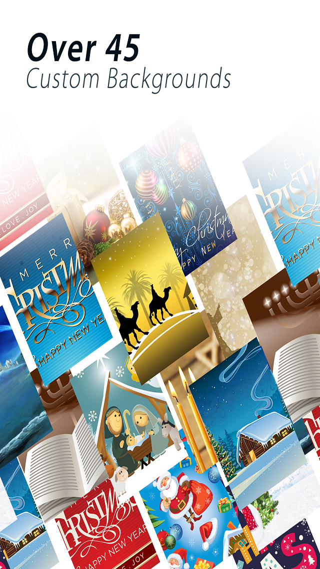 • 45+ Christmas, Holiday, Colorful backgrounds & themes to choose from including Nativity, Santa Clause, Snowman, Trees, Hanukkah, Chanukah, Merry Christmas text.