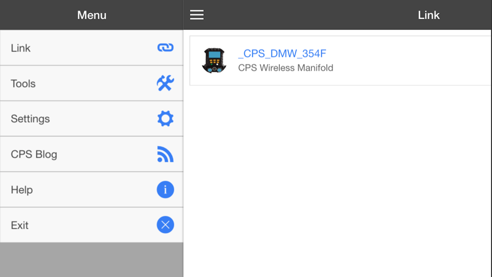 The Manifold Link with CPS Link™ mobile application will remotely communicate with and control select functions on a line of BlackMax® Wireless Digital Manifolds for servicing air-conditioning and refrigeration equipment. Developed by CPS Products, Inc., CPS Link™ also provides additional convenient capabilities not found in non-wireless manifolds such as comprehensive views of system measurements, graphical depictions of test functions, data logging and more.
