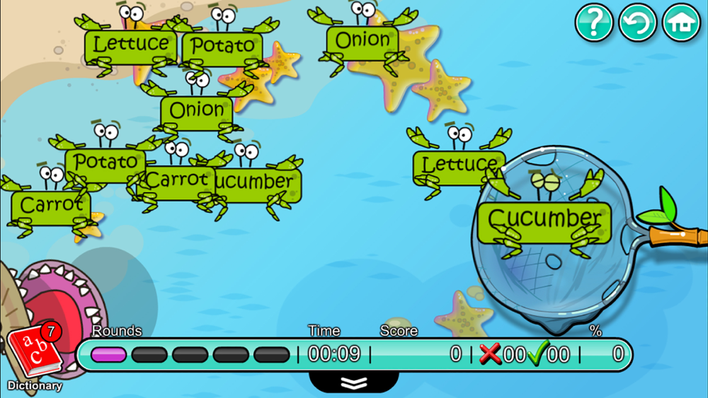• 12 exercises and game activities: Rich Picture, What to Say, Fish Spelling, Colour this, Drag and Spell, Catch the Crab, Grammar Demo, Sing Along, Word Search, Sentence Construction, Point it Out, Interview