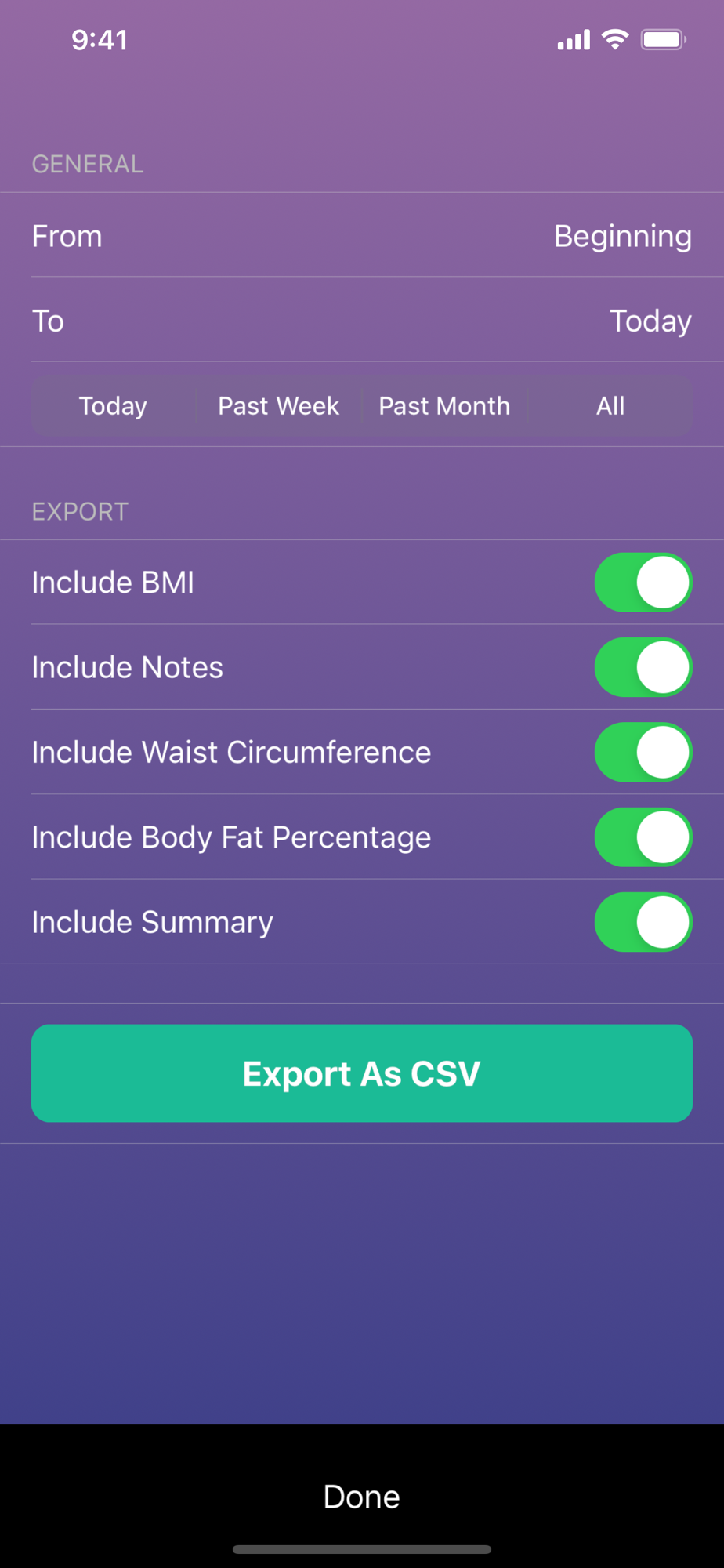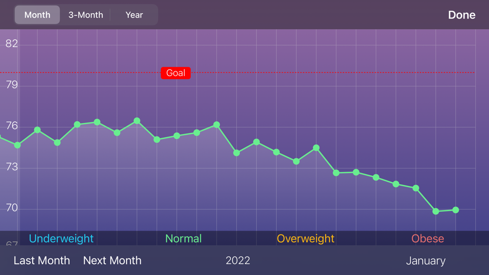 A gorgeous weight graph will help you track your progress, monitor your BMI and also help keeping your weight gain/loss at a healthy rate.