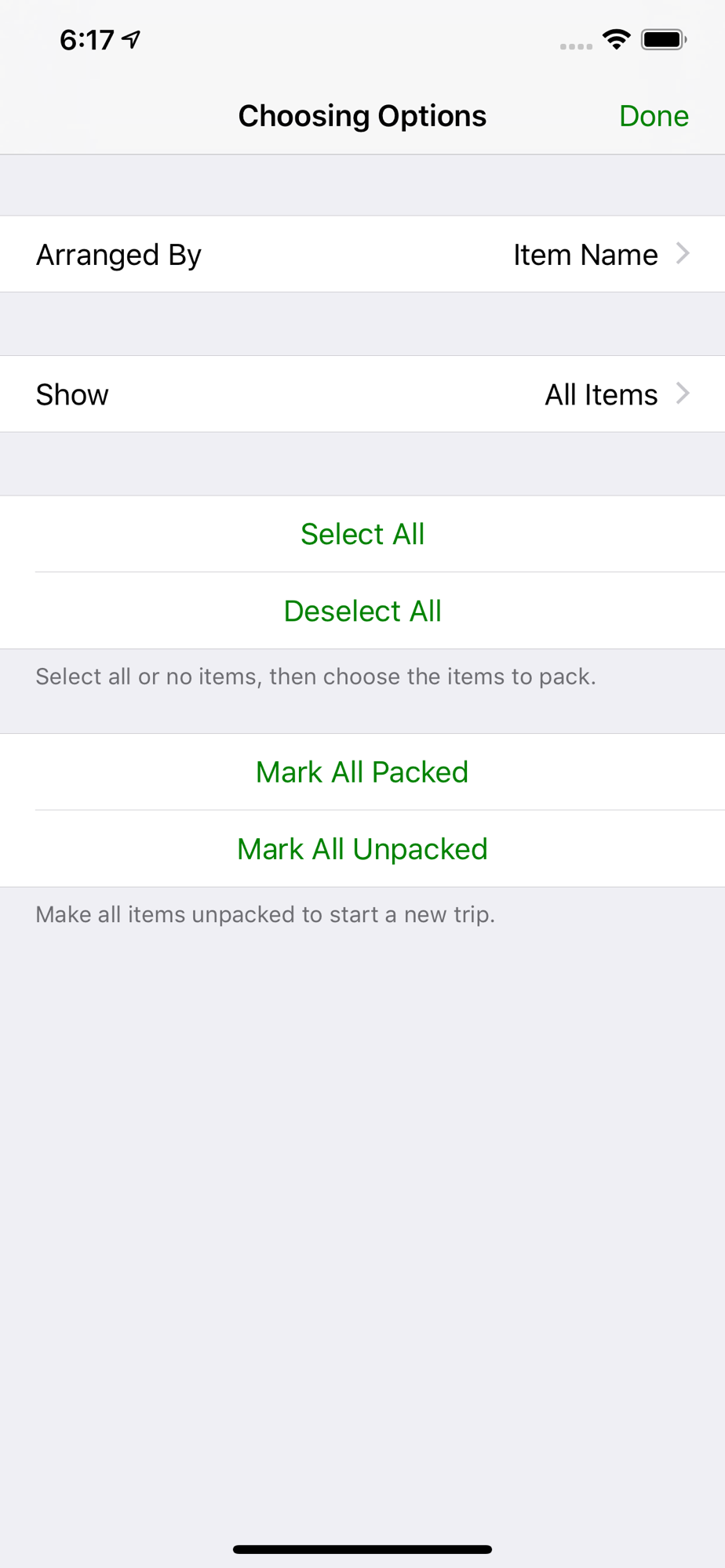 The Choose and Pack lists can be arranged by item name, tag, or person name, and can be filtered to show only packed, packed at the end, or all.