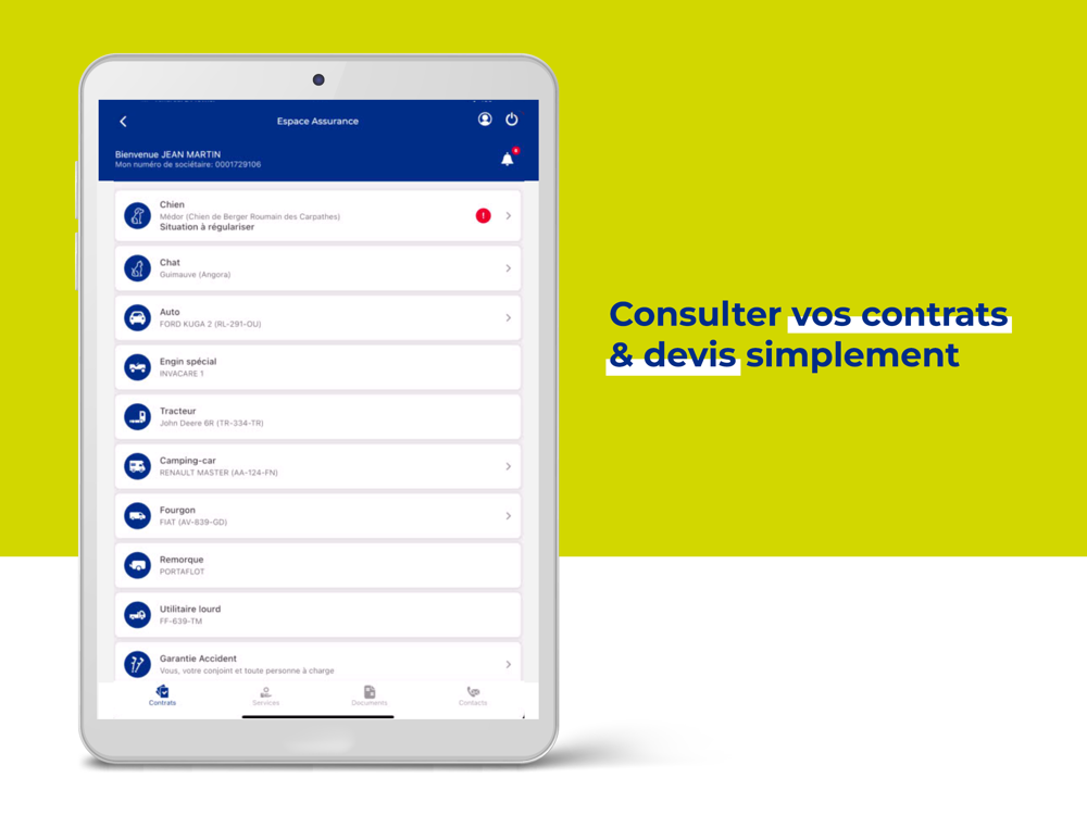 - Consulter vos contrats, les garanties associées (auto, deux-roues, camping-car, habitation, prévoyance, santé, garantie accident, etc.)