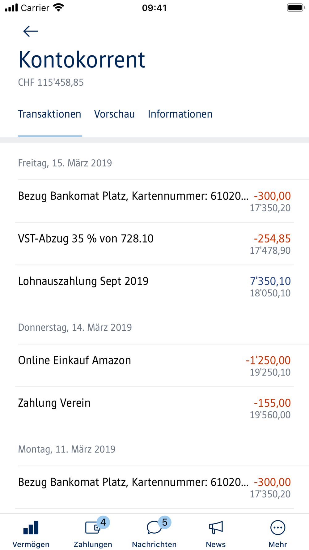 • Vermögen: Rufen Sie jederzeit Kontostände und Buchungsdetails ab.
