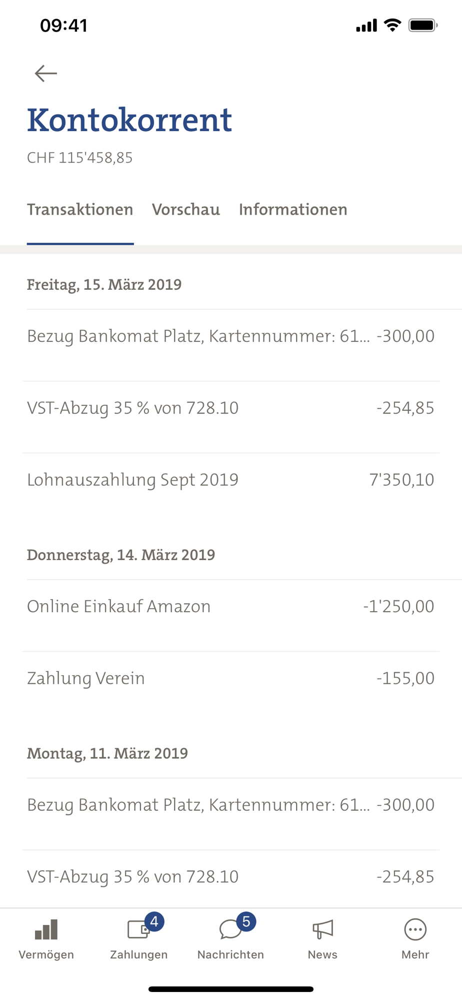 • Zahlungen: Inlandzahlungen können Sie bequem via App ausführen. Tätigen Sie Kontoüberträge, erfassen Sie Daueraufträge, scannen Sie Einzahlungsbelege mit der Handykamera oder geben Sie eBills frei. Zahlungen an neue Zahlungsempfänger können in der App erfasst, müssen aber aus Sicherheitsgründen vor der Ausführung einmalig im e-Banking signiert werden. Zahlungen ins Ausland können nur im e-Banking erfasst werden.