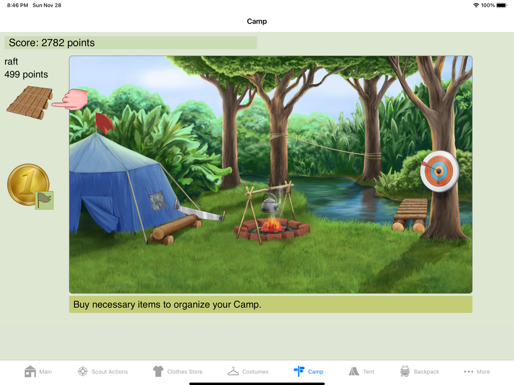 Yet another goal of the game is to earn enough points and purchase all available items for all the scenes including the Camp, the Tent and the Beach and all items for the Backpack.