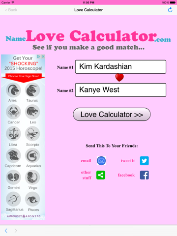 See who is your Perfect Match! Love Calculator analyzes your name and the name of potential matches to see who would make the perfect match. Love Calculator uses the ancient art of Numerology in this entertaining and fun app.
