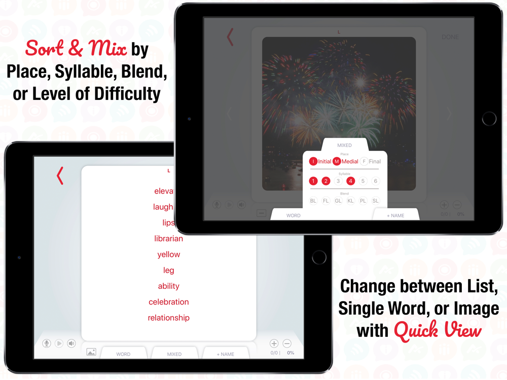 For rapid drill, content can be used in list view. For more focused practice content can be used in single stimuli view to see one word, phrase, sentence, or concept at a time.