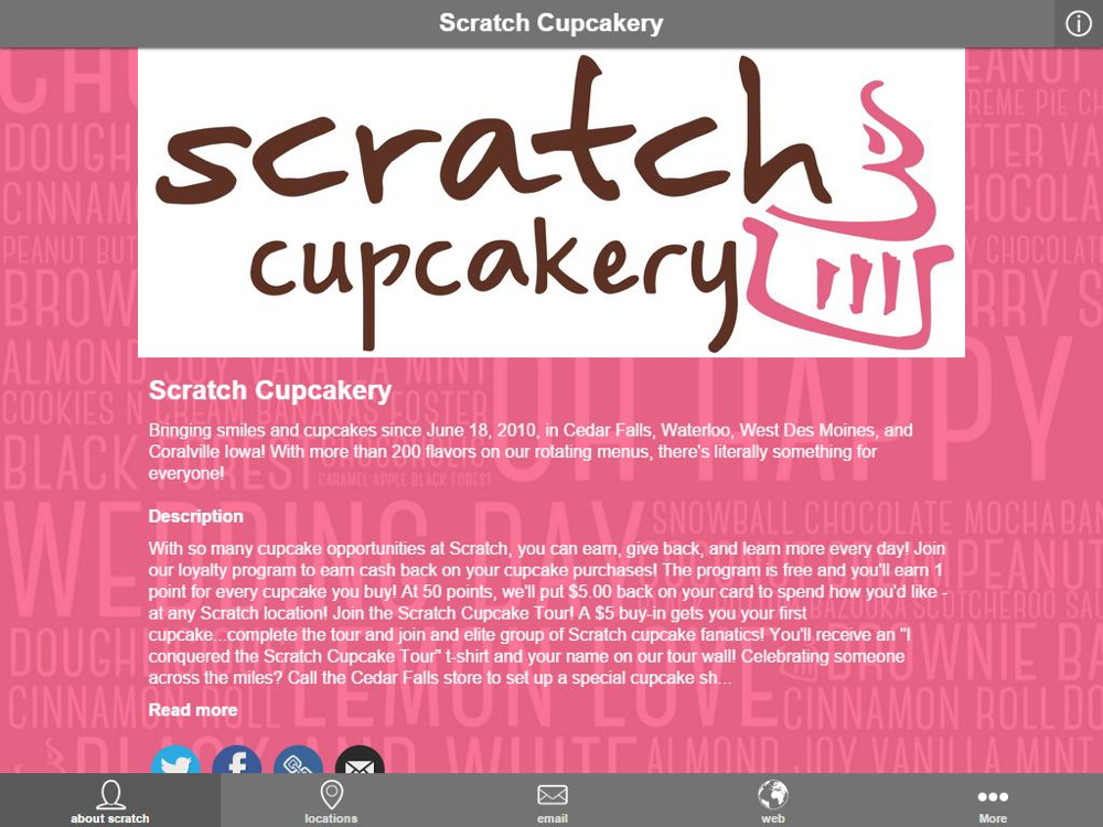 The official Scratch app brings our cupcake storefronts into your mobile device! Learn more about our 4 Iowa locations, navigate our cupcake calendars with ease, contact a store...it's never been easier!