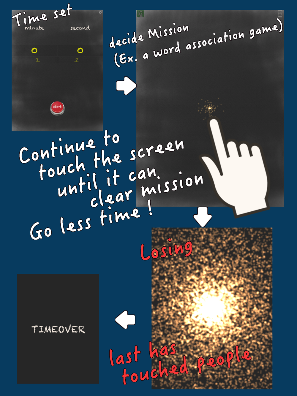 If you continue to touch your finger to the screen, sound the sound of the fuse, will decrease the time it was set to start the countdown internally. (Remaining time is not notation.Chosen time might increase or decrease is added somewhat.)