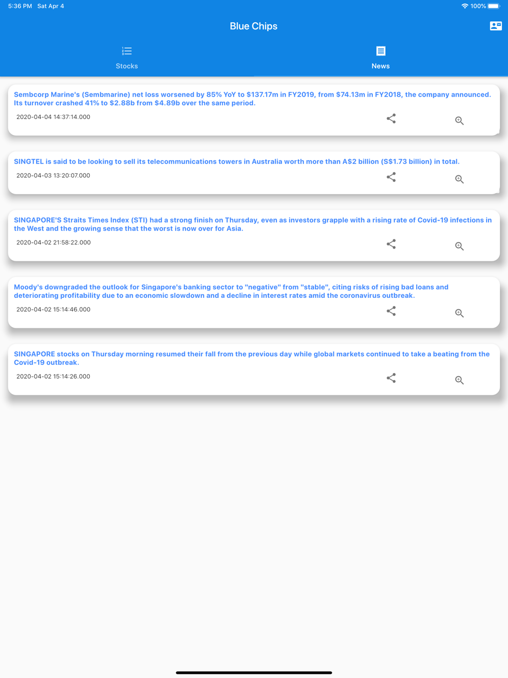 This app identifies the blue chips in Singapore and provides a quick glance of their stock price, dividend payout history, upcoming ex date and amount.