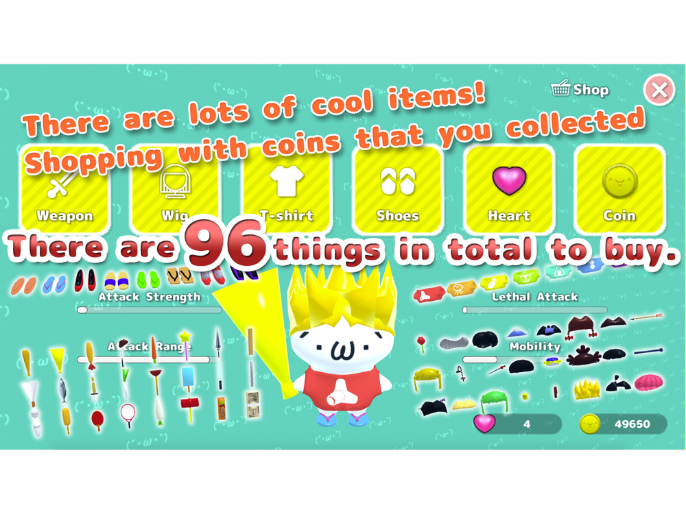 You can buy weapons, wigs, T-shirts, heart,and shoes at the shop.