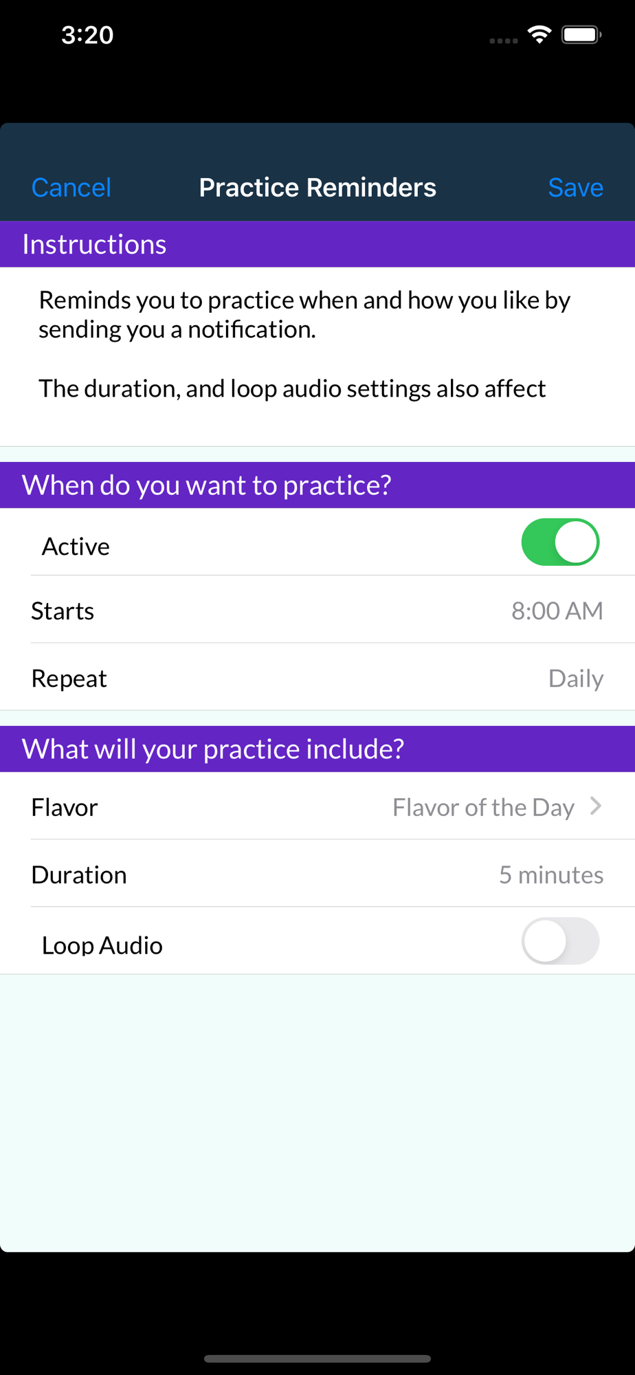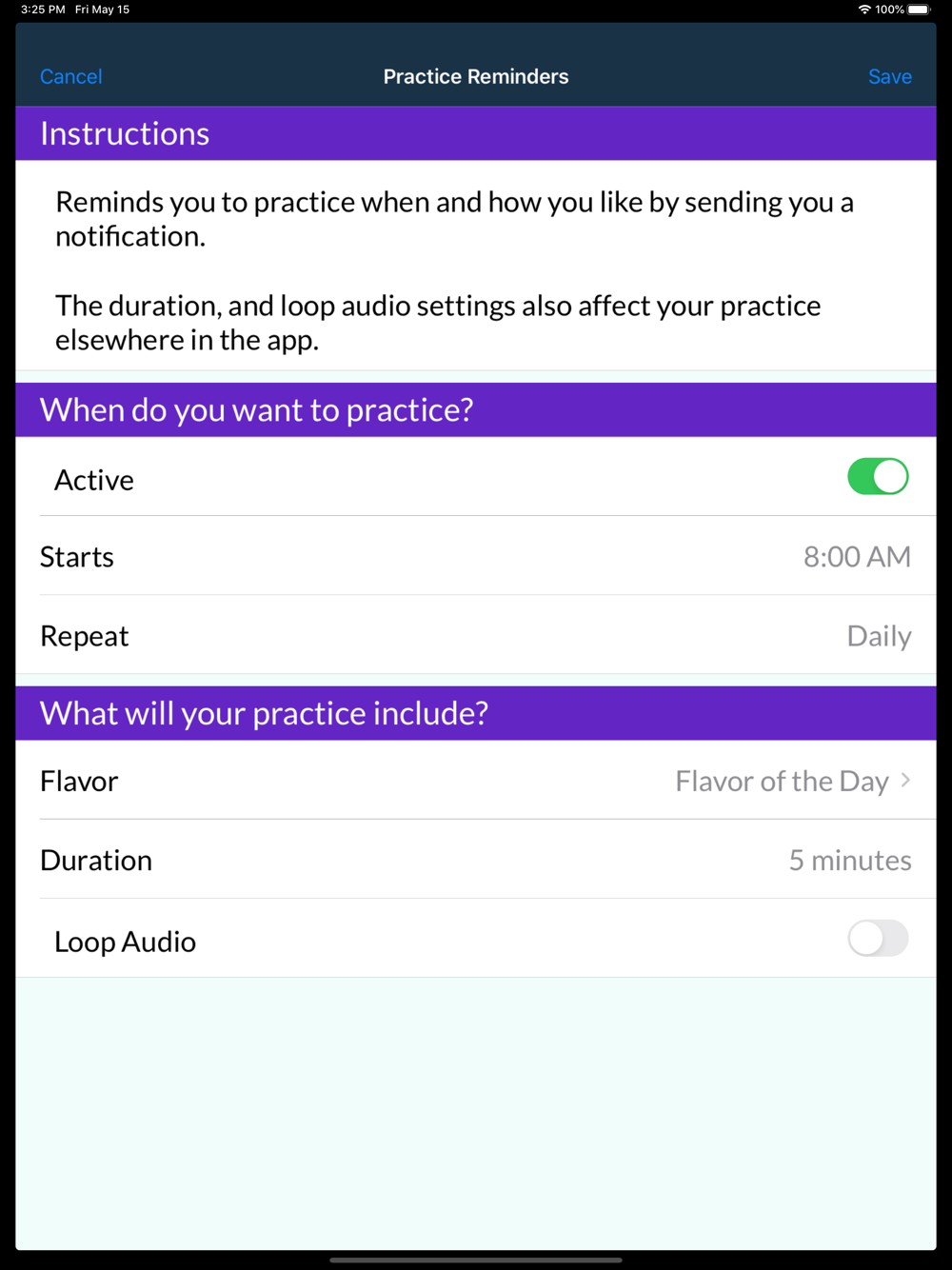 • Set the Duration of your practice