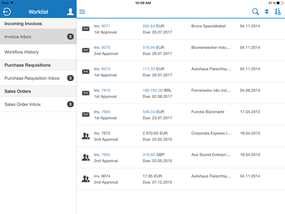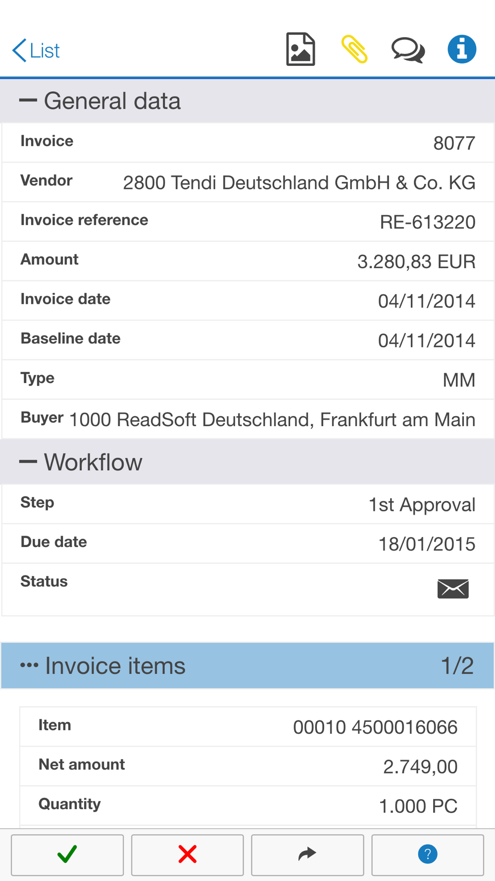 Users can access worklists and process financial documents and requests such as invoices, purchase requisitions, sales orders, etc. directly from their smartphones using Kofax ReadSoft Mobile. You can review the live document, image data, attachments, and workflow status, as well as approve, reject or add a note to it - all from a mobile device.