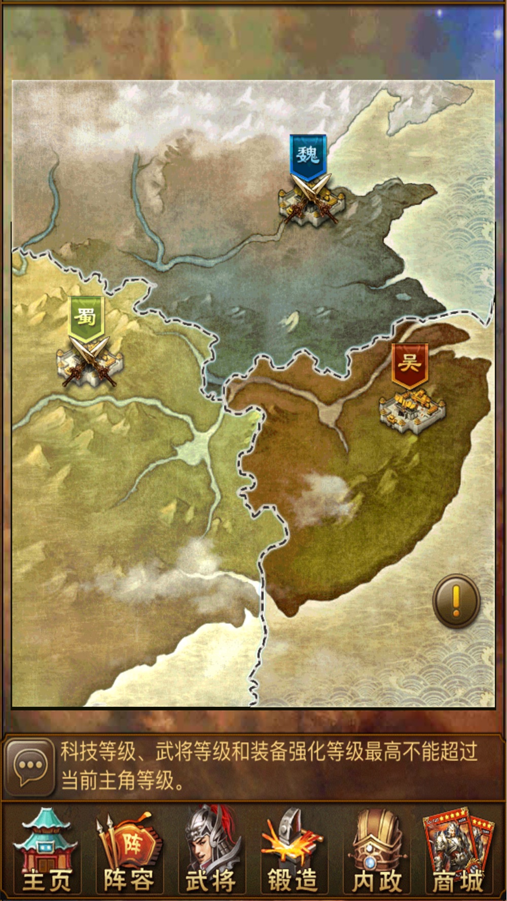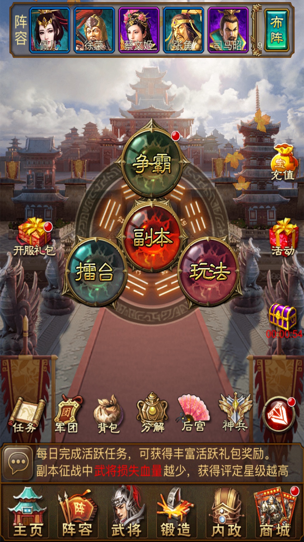 100多个知名武将!几十个兵种与单独匹配的战术!十几个九宫格搭配阵型!游戏当中的策略战斗系统可以让玩家充分发挥自己的排兵布阵能力,巧妙利用阵形、兵种、战法来达到最大化地发挥武将的战斗实力! 更有独有的“武缘”技能点亮系统使武将与武将之间产生战斗羁绊,从而在战争推图和实力角逐中发挥巨大威力!