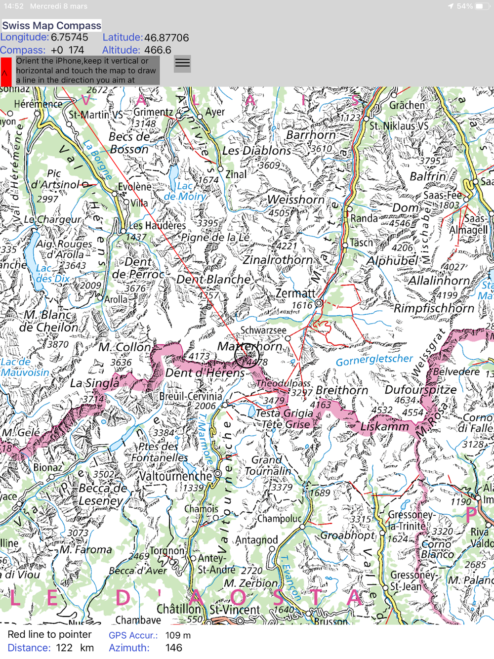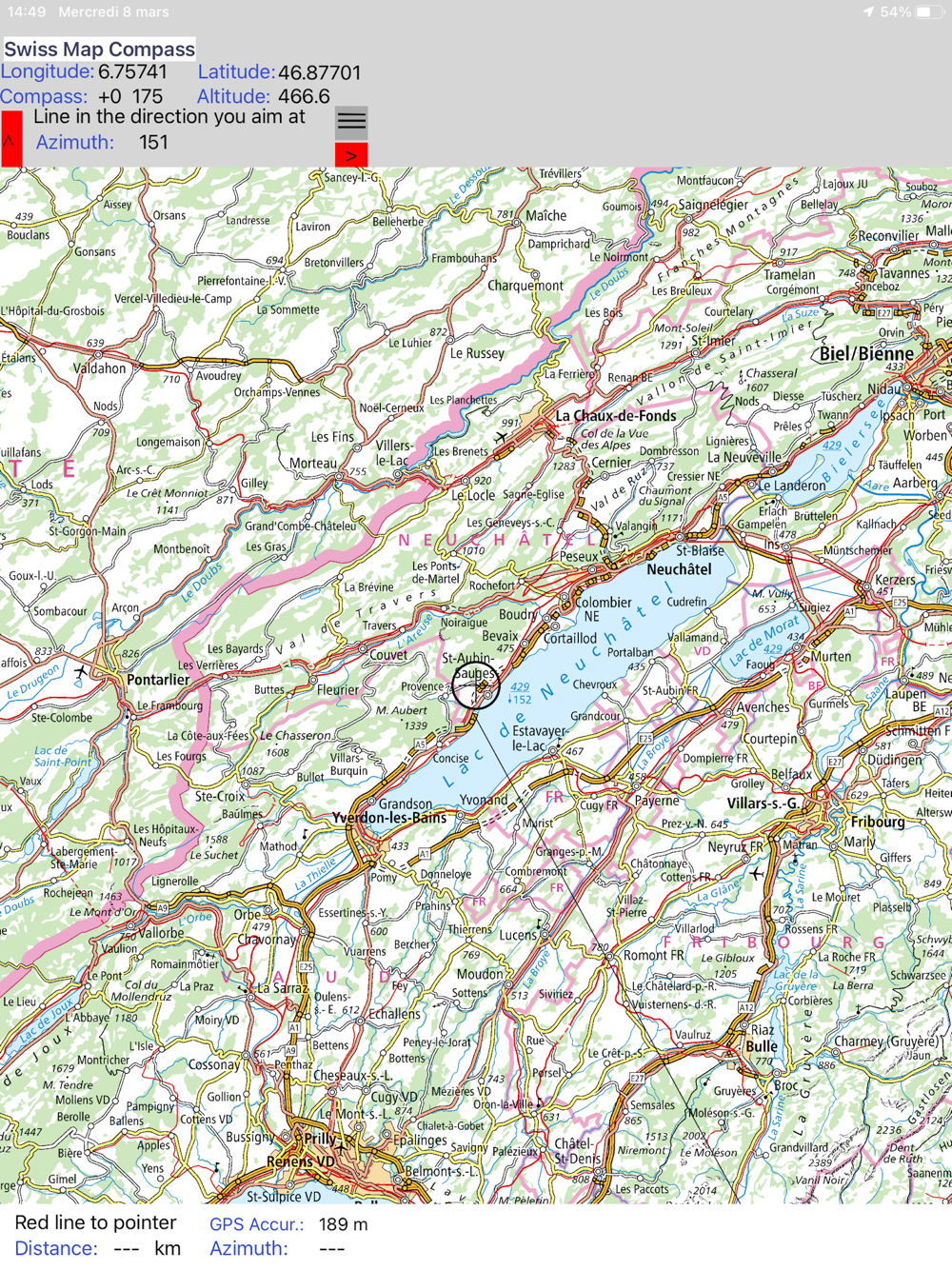 Sometimes, we would like to know what we see far away. With this app, you orient your iPhone and you draw a line on the map in the direction measured by the iPhone.