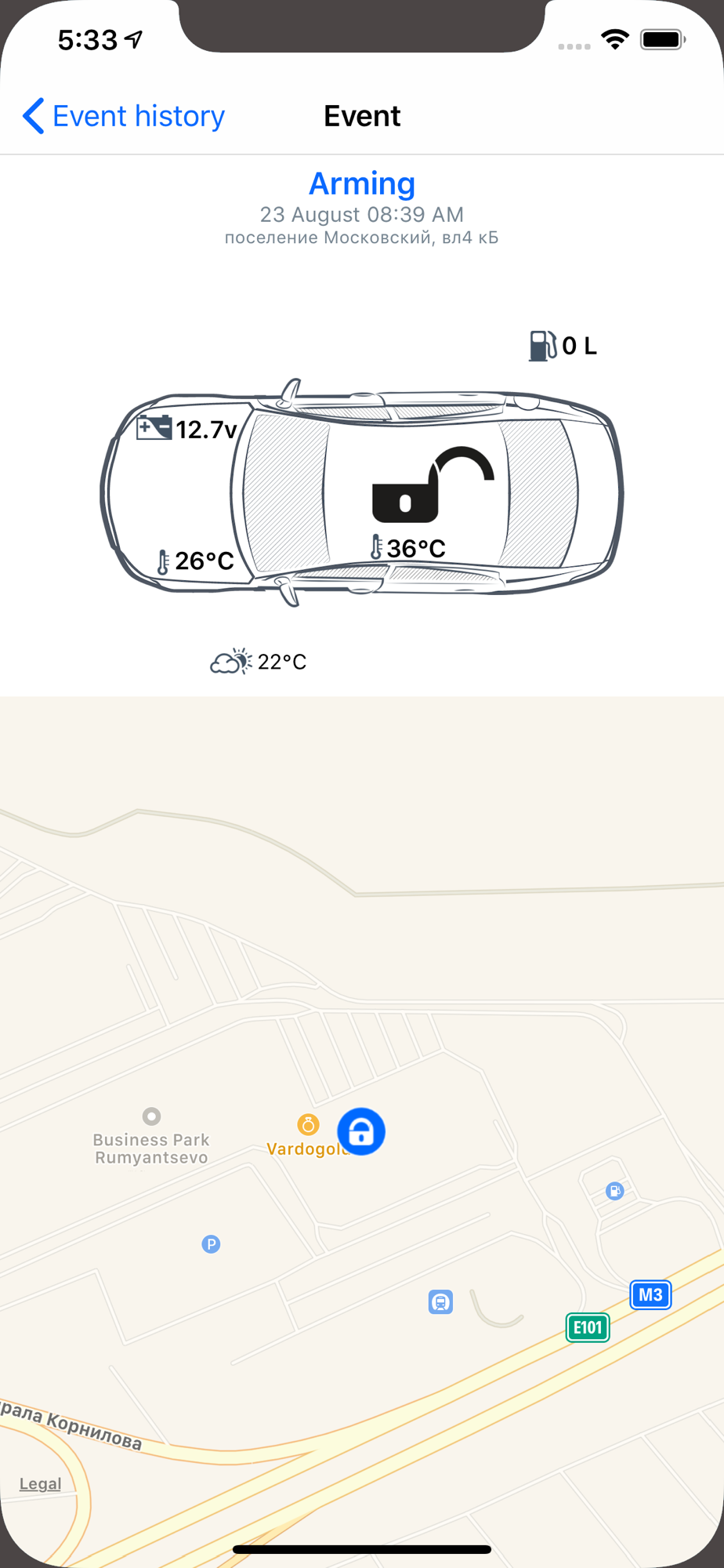 – Monitoring the current state of your car: statuses of all security zones and sensors, current fuel level (it depends on connections), engine temperature, car interior temperature, outside temperature (additional sensor is required), current car location (for systems with a GPS/GLONASS-receiver).
