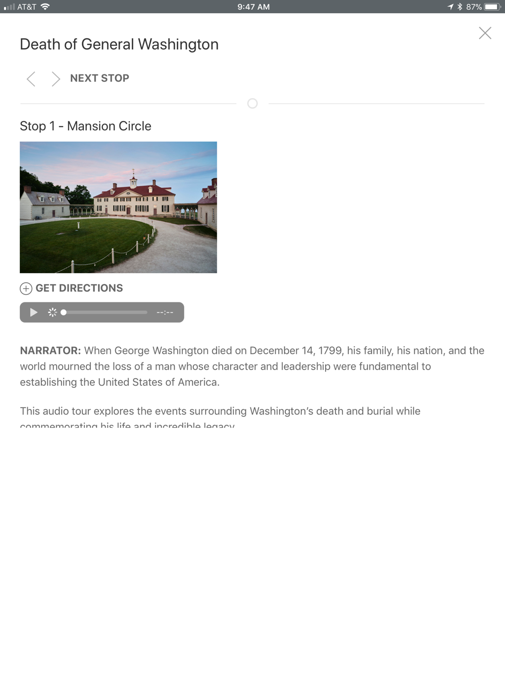 • Interactive map that shows you key locations as you walk around the Mount Vernon Estate