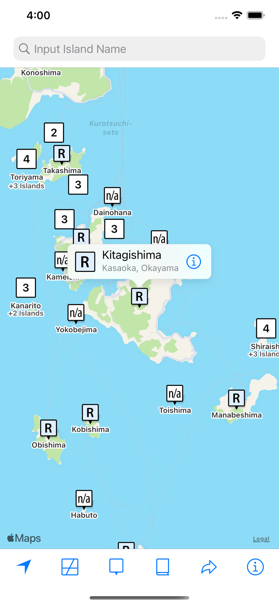 This app contains information on approximately 6,000 islands in Japan. Island attribute information includes the island's name, kana name, English name, location, area, coast length, population, whether it's populated, island grouping name, applicable act, designated area name, basis for territorial sea only, basis for EEZ (Exclusive Economic Zone), populated remote territorial island (RTI) area, specific populated RTI area, name of populated RTI area, included nature park, natural monument, access, and notes. If you are interested in learning about islands in Japan, this app would be very useful.
