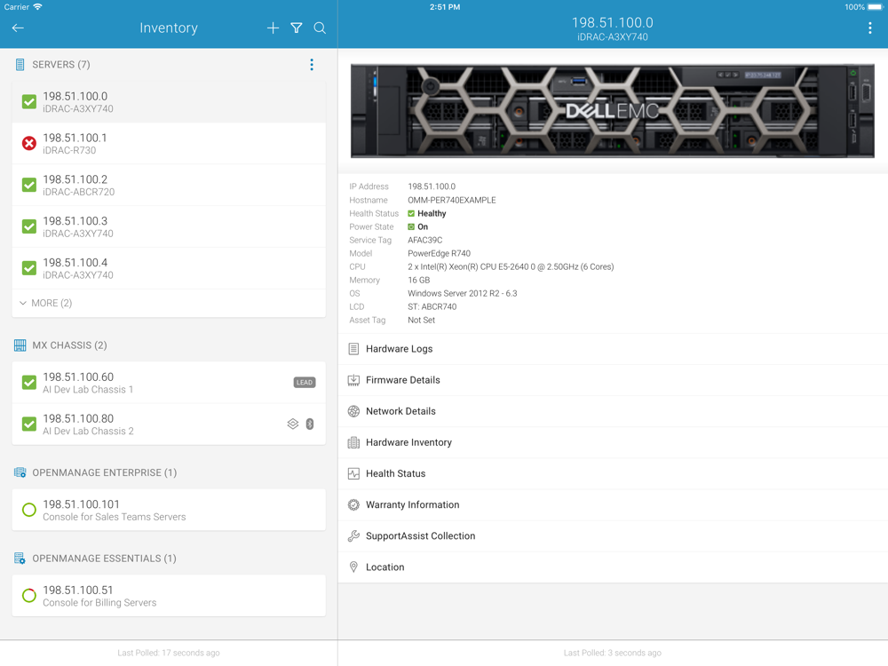 • Browse server or chassis details, health status, hardware & firmware inventory, networking details, and System Event or LC logs. (For MX7000 chassis, use Augmented Reality feature to monitor and troubleshoot easily and quickly.)
