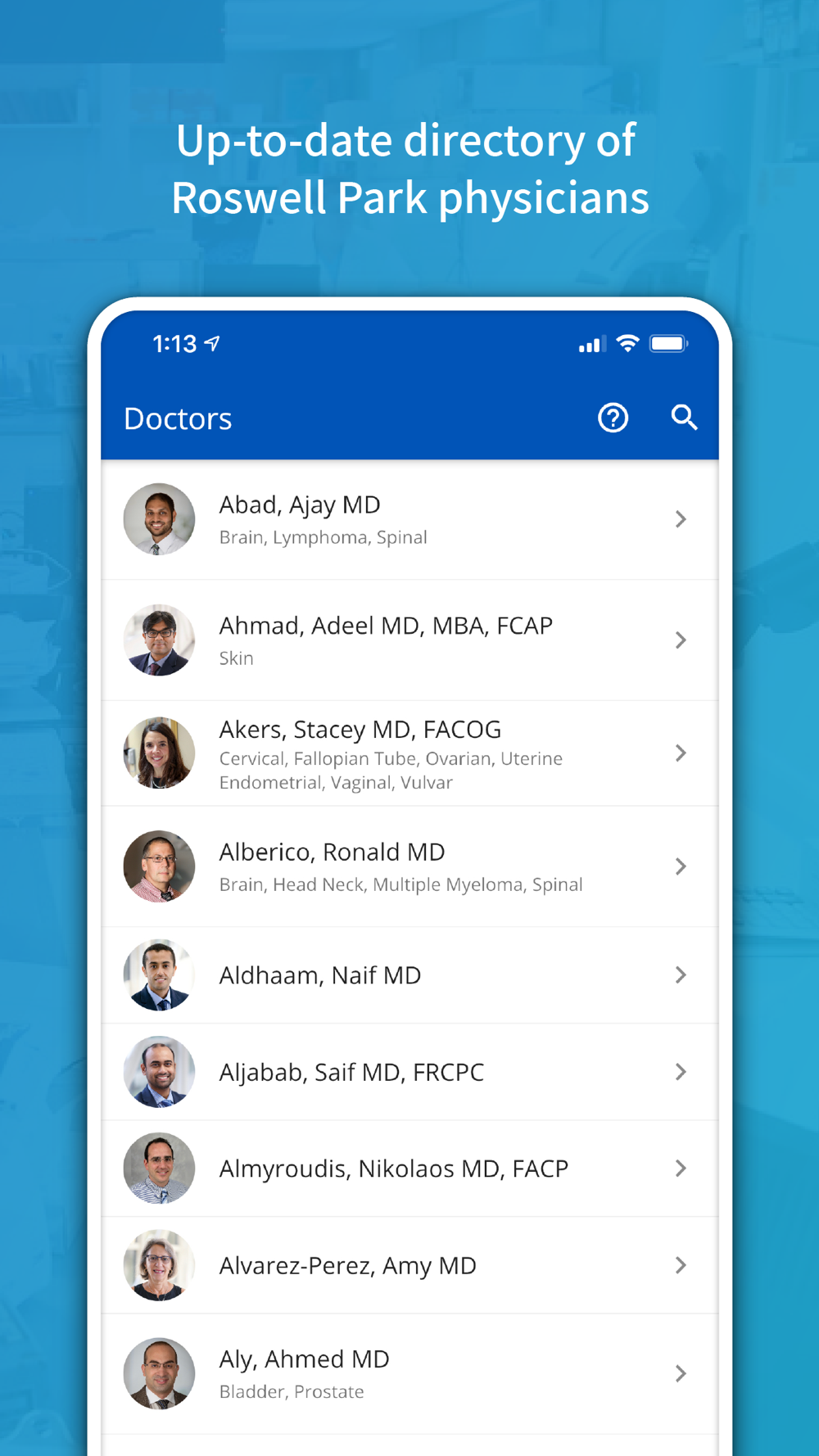 The RPMD free download is exclusively for physicians and physician offices and includes a complete, up-to-date directory of all Roswell Park Comprehensive Cancer Center physicians, including areas of expertise and special interest, certifications, email address and phone numbers. The app facilitates physician-to-physician referrals and communication.