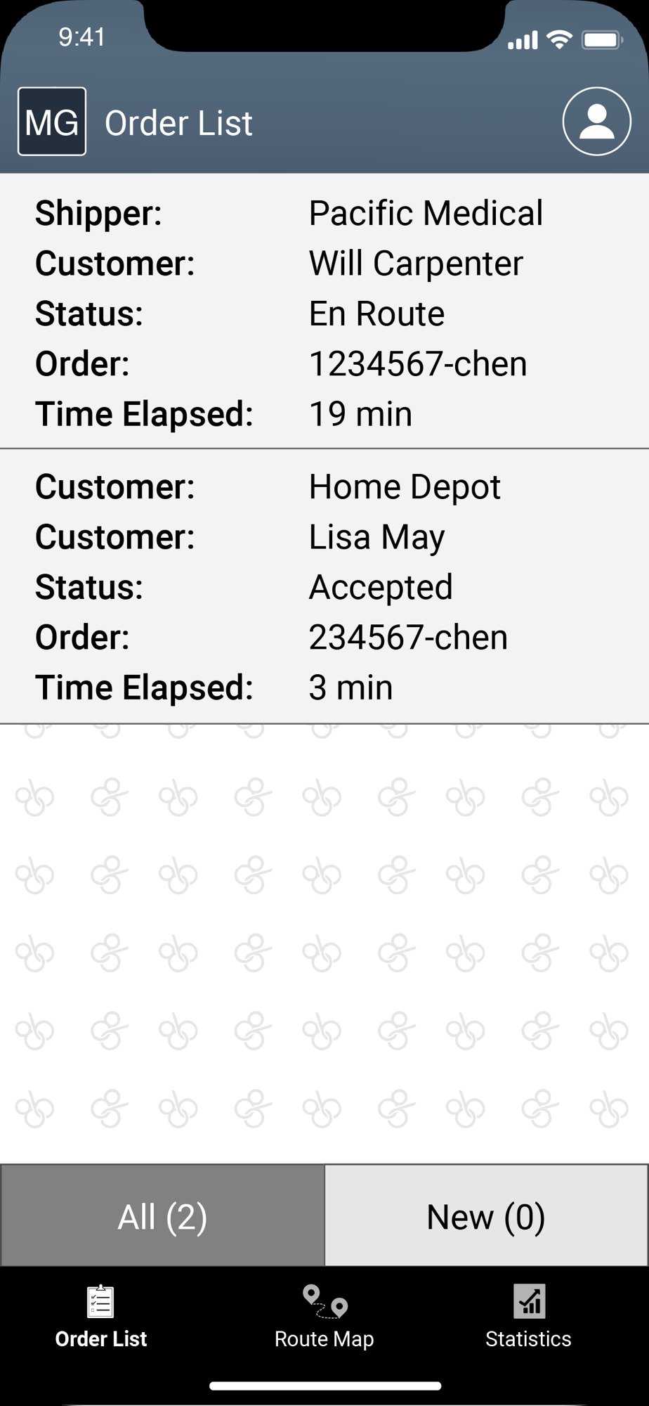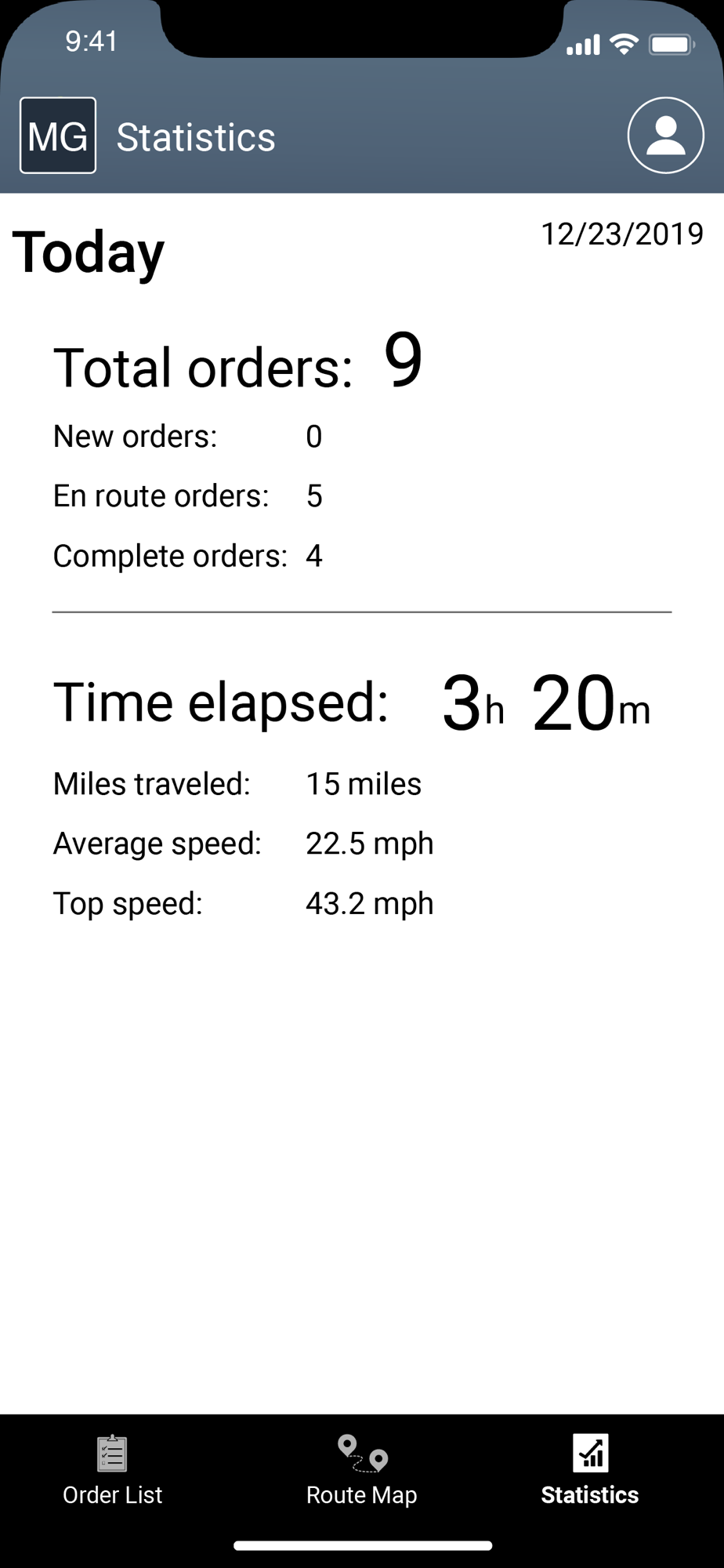The day’s travel statistics are conveniently accessed through the stats view, so the user doesn’t have to do the math. Users see an overview of the days orders, as well as, distance traveled, average speed, and top speed.