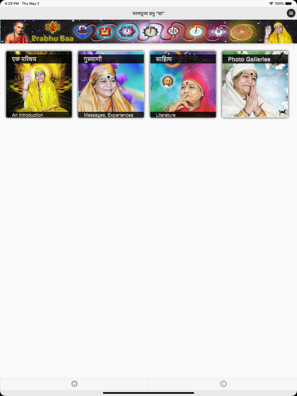This App is dedicated as a humble offering to Parampoojya Paramhansa Swami Sugandheshwaranand Rajyogi Prabhu "Baa”. Her Holiness is a distinguished spiritual leader of the present day world. She was blessed with "Shaktipaat Diksha" by Parampoojya Shri Gulwani Maharaj. Her Holiness leads a very simple and pious life. She showers on Her disciples and devotees constant love, mercy and deep affection and that is why she is popularly and lovingly called “Baa” (the mother.) She conveys Her messages through devotional songs, in congregations and the experiences one gets and not through a discourse or elucidation (“Pravachan”.)