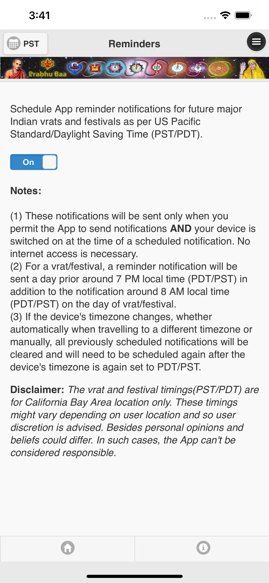 * For devices in the Indian Standard Time(IST) and Pacific Standard Time(PST) timezones, App reminder notifications can be optionally scheduled for Indian festivals and vrats.